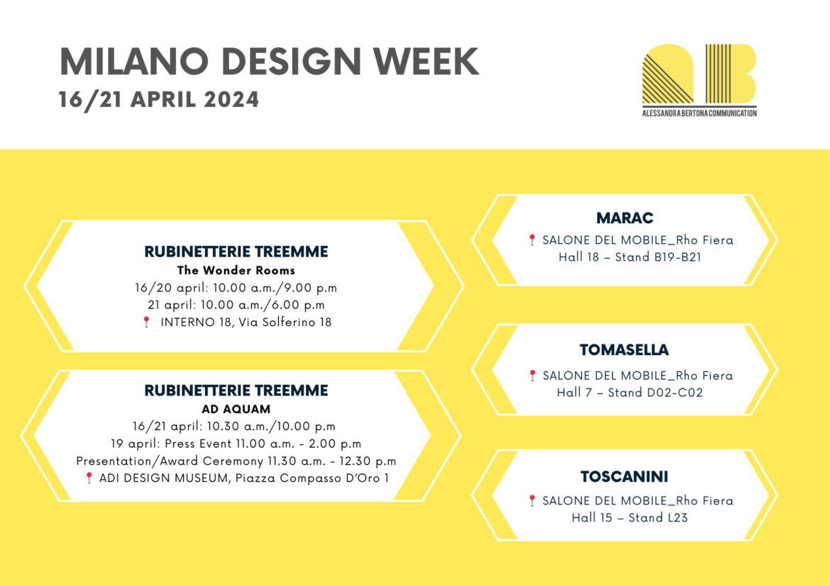 Milano Design Week is an eagerly anticipated event among aficionados, professionals in the sector and merely curious visitors, offering an opportunity to discover the latest trends and innovations in the world of décor and interior design. During the 2024 edition, a number of clients of Alessandra Bertona Communication will be present at the Salone del